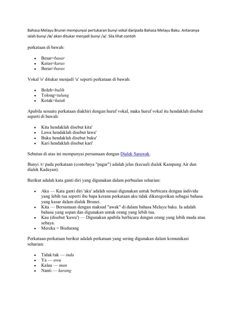 Bahasa Melayu Brunei Mempunyai Pertukaran Bunyi Vokal Daripada Bahasa Melayu Baku Pdf